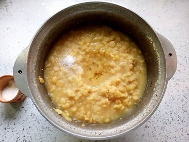 Влейте растительное масло, неплотно прикройте крышкой и готовьте на медленном огне. В процессе приготовления содержимое кастрюли нужно периодически мешать, чтобы горох не пригорел и быстрее разварился. Замоченный колотый горох варится примерно 40-50 минут, целый в течение часа. А сухой целый горох придется варить в течение 2.5 часов и 1.5 часа колотый.