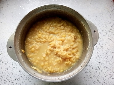 У меня был желтый колотый горох, я его хорошо промыла и залила фильтрованной водой. Варила в казане, в нем пюре не пригорает. Воспользовалась советом добавить соду, хоть и сомневалась. Это помогло, твердый горох стал гораздо мягче. Варка заняла у меня примерно 2 часа, периодически перемешивала горошек. Он хорошо разварился!