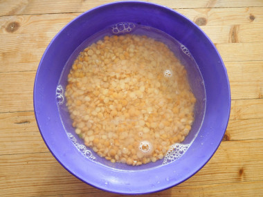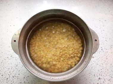 Горох содержит большое количество белка, поэтому его нужно хорошо промыть 2-3 раза в теплой воде. Влейте холодную воду больше самого гороха в 3-4 раза, и оставьте на 8-10 часов для набухания. Если вы не замочили горох заранее, то залейте его кипятком на 30-40 минут, и он сварится намного быстрее. Воду после замачивания слейте, а горох еще раз хорошенько промойте. Положите промытый горох в кастрюлю из нержавеющей стали с толстыми стенками и дном.