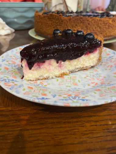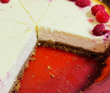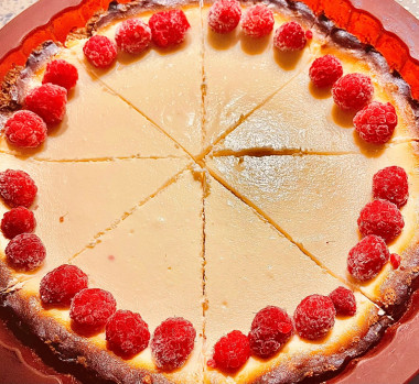 Приготовила к встрече гостей чизкейк с бананом и творогом. Получилось очень вкусно! Чизкейк нежный, действительно тающий во рту. В качестве украшения использовала малину. Всем чизкейк так понравился, что за вечер не осталось ни кусочка. Спасибо большое!