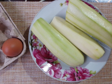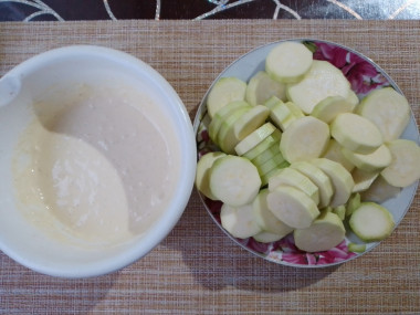 С кабачков сняла кожицу и нарезала их кружочками. Обмакивала каждый кружок в кляре и жарила до золотистого цвета.