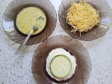 Кружочки кабачка обваляйте в муке, затем обмокните в яичной смеси.