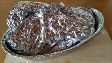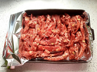 Возьмите форму для запекания. Дно и бока формы застелите фольгой, оставьте при этом длинный свисающий край, чтобы накрыть ребрышки сверху. Выложите ребрышки в форму и накройте фольгой при этом края зафиксируйте по краю всей формы.