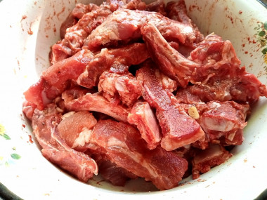 Сложите ребрышки в просторную, удобную емкость, посолите, посыпьте хмели-сунели и добавьте томатную пасту. По желанию можете добавить любые другие специи на ваш вкус.