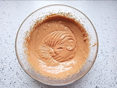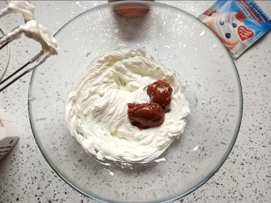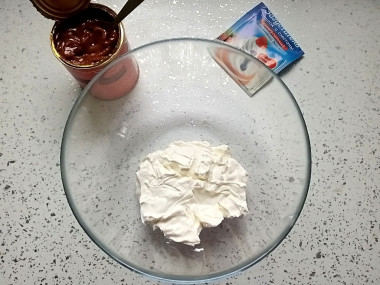 Взбейте сметану миксером или венчиком до пышности, взбивайте недолго, не забывайте что при чрезмерном взбивании сметана может превратиться в масло.