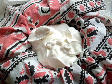 Предварительно откиньте сметану на марлю минут на 20-30, чтобы стекла лишняя сыворотка и сметана стала густой.