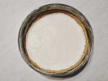 Выложите начинку на охлажденный в морозилке корж. Разровняйте поверхность силиконовой лопаткой. Поставьте чизкейк в холодильник на 3-4 часа. После чего можно отправить его на 25 минут в морозильную камеру.