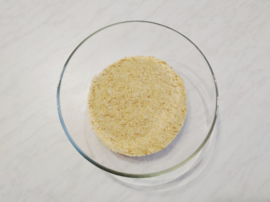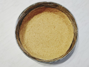 Какую емкость для торта можно использовать? Возьмите разъемную круглую форму диаметром 20-22 см. Застилать пищевой пленкой не нужно. Также можно использовать эмалированную миску, силиконовую, пластиковую форму или разложить десерт по порционным креманкам. Выложите в нее крошку, распределите по дну и бокам, хорошо утрамбуйте руками или ложкой. Уберите в морозилку на 10-15 минут.