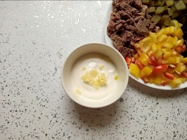 Для заправки чеснок пропустите через пресс и смешайте с майонезом.
