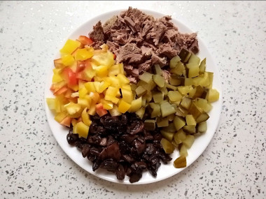 В салатник выложите говядину, грибы, огурцы, болгарский перец. Заправьте салат майонезом.