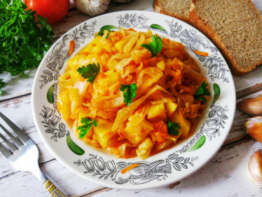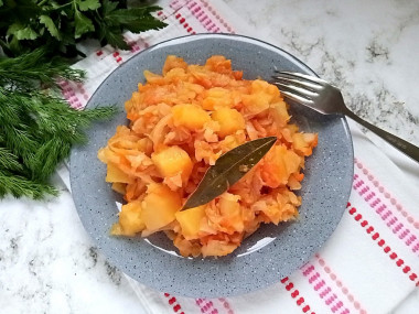Мне понравился вкус тушеных овощей, они прекрасно сочетаются друг с другом! Капуста и картошка нежные и сочные, блюдо отлично подошло в качестве гарнира к рыбе.