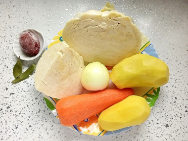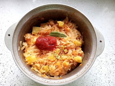 Лук нарезала полукольцами и обжарила до золотистого цвета. Готовила я в казане меньшего объема, поэтому капусту тушила подольше под закрытой крышкой. После того как она хорошо осела, выложила картошку, морковь и влила воду. Томатную пасту добавила в последнюю очередь, т. к. картошка у меня была жесткая. Как известно, кислота в томате увеличивает время приготовления картошки. Также добавила лавровый лист, соль и овощную приправу. Все перемешала и дала овощам пропитаться всеми вкусами и ароматами.