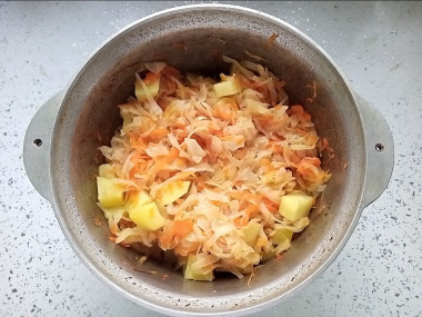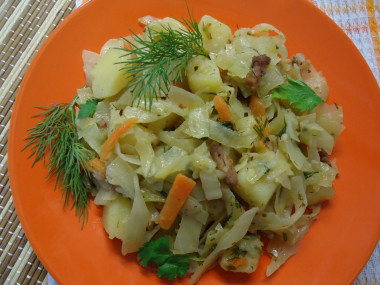 Сразу извиняюсь за то, что я не умею красиво фотографировать блюда, но мне все равно захотелось сказать свое человеческое спасибо за этот рецепт тушеной капусты с картошкой в казане. Правда, я его слегка модернизировала: добавила полукопченую колбасу, обжаренную на сковороде. Очень вкусно!