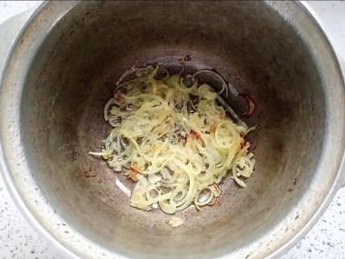 В казане на среднем огне разогрейте растительное масло. Выложите лук и обжарьте, помешивая, до прозрачности. Если у вас нет казана, можете готовить блюдо в большой глубокой сковороде, но при этом возможно придется пересчитать количество продуктов, чтобы все влезло. У меня казан на 5 литров.