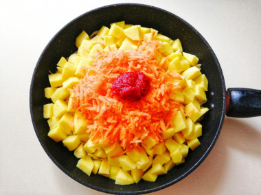 Добавьте в казан картофель и морковь, томатную пасту и перемешайте.