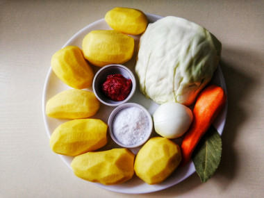 Как потушить капусту с картошкой в казане на плите? Для начала подготовьте необходимые ингредиенты по списку. Томатную пасту в этом рецепте можно заменить на измельченные помидоры в собственном соку или томатный кетчуп. Овощную часть и специи можете дополнять по своему вкусу.