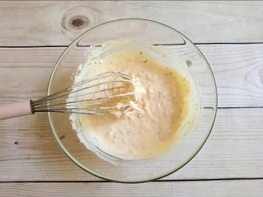 Кефир я взяла обычный, 2,5% жирности, подогрела его до чуть теплого состояния. Сыр у меня российский, он хорошо плавится, натерла его на крупной тёрке. Добавила овощную приправу и сушеный укроп. В такие оладьи хорошо бы добавить пучок зеленого лука для сочности и приятной остринки, но у меня в наличии не было.