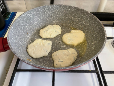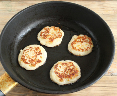 На горячую сковороду налейте растительное масло и ложкой выкладывайте немного теста. Обжаривайте оладьи на небольшом огне по 1-2 минуты с каждой стороны. Оладьи должны успеть прожариться внутри, поэтому большой огонь делать не надо. Как выбрать сковороду и масло для жарки читайте в конце этого рецепта.