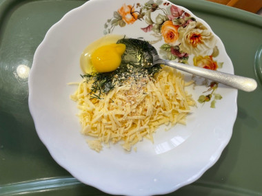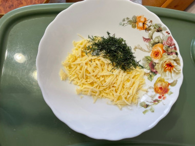 Для приготовления теста берите удобную глубокую чашу. Натрите в чашу сыр и добавьте к нему измельченную зелень. Зелень может быть любая. Я добавляю свежую зелень укропа.