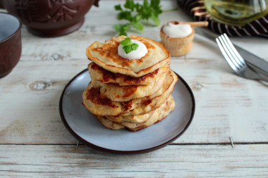 Снимайте оладьи со сковороды и выкладывайте на бумажное полотенце, чтобы удалить с них лишнее масло. При подаче такие оладьи можно дополнить различными соусами, например, сырным или пикантным ягодным. Приятного аппетита!