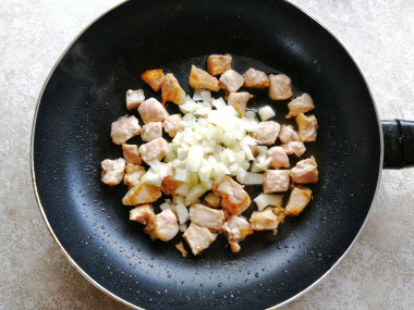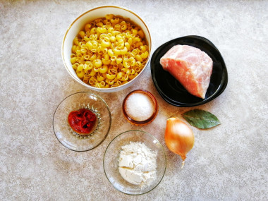 Вместо говядины взяла свиной карбонат, обжарила мясо на растительном масле вместе с луком (добавила лук от себя). Когда мясо покрылось румяной корочкой, посолила, добавила немного муки, перемешала, подержала на огне минуты две, затем выложила в сковороду томатную пасту и залила все горячей водой (заменила ею мясной бульон). Хотя мясо у меня было мягкое, тушила его часа 1,5. Пока оно готовилось, отварила макароны.