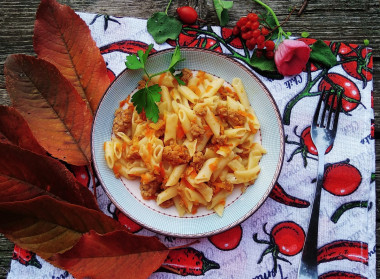Макароны с фаршем у нас любят дети. Приготовила им порцию на 400г. макарон. Соответственно увеличила пропорции и других продуктов. Фарш взяла свиной, перекрутила мясо на мясорубке с крупной решеткой. Морковь потерла на крупной терке, а вместо помидора взяла домашний томатный соус. Он придает приятную кислинку. Мясную поджарку приготовила в казанке, это удобно, стенки высокие и сок не разбрызгивается на плиту. Блюдо готовится быстро, это его главный плюс для меня. Ну а для детей самое главное, что вкусно! Это действительно вкусно, макароны получились сочными, пропитанными мясной подливкой и овощными соками. Мяса получается много, его приятнее жевать, ведь оно не кусочками) Это актуально для тех, кто не любит кусковое мясо) Блюдо полезное, сытное, простое в приготовлении, подходит на ужин с овощным салатом.