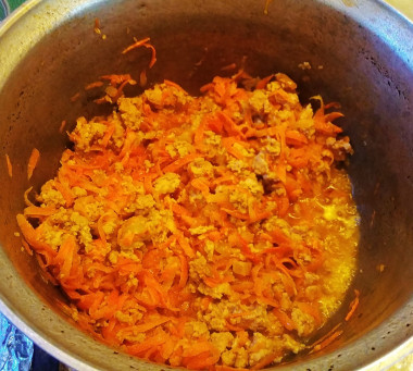 Добавьте мясной фарш на сковороду к овощам и продолжите обжарку, разбивая его лопаточкой. Жарьте фарш еще около 5 минут.
