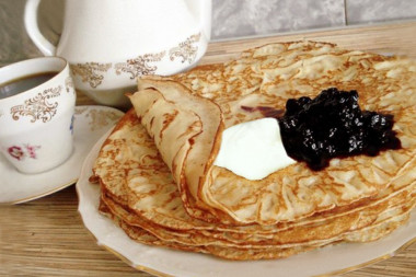 Готовые блинчики складывайте друг на друга и накрывайте крышкой, чтобы они не подсыхали. Под крышкой блины будут пропариваться и останутся мягкими и нежными. Готовые блинчики дополните сметаной, сгущенкой или джемом. Приятного аппетита!