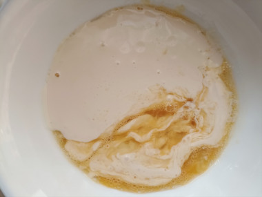 Затем влейте растительное масло и добавьте муку. Все смешайте до однородного состояния, чтобы не оставалось комочков муки. Для этого можно воспользоваться миксером.