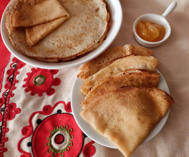 Испекла блины на ряженке с кипятком. Приготовила половину порции. Очень хороший рецепт, блинчики при выпечке не прилипают к сковороде, не рвутся , получаются мягкие, эластичные, но не "резиновые". И на вкус отличные, в меру сладкие. Спасибо за рецепт, Юлия М!