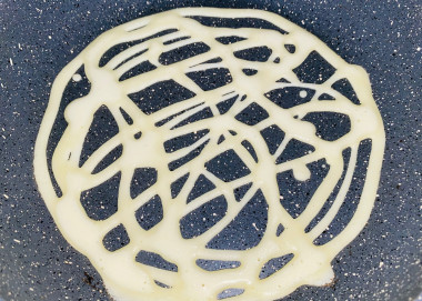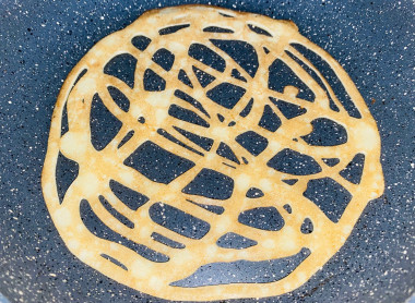 6. А теперь налейте часть теста в кондитерский мешок, установив насадку с тонким носиком, и нарисуйте узор на горячей сковороде (это очень забавно, не стоит бояться, все получается шикарно!).