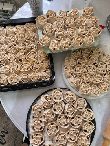 Положите в центр фарш и слепите манты. Готовьте манты на пару, около 40 минут.