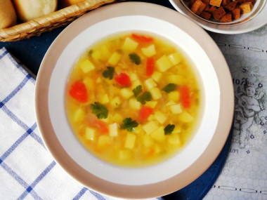 Супчик из садика)обожала в саду такой с гренками)))теперь и своим готовлю деткам,только вот без гренок в этот раз жаль.И плюс готовила на курочке не копчёной,отчего он ничуть не хуже!