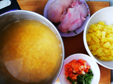 Как сварить гороховый суп с курицей? Подготовьте ингредиенты. Мясо заранее разморозьте. Как это сделать правильно - читайте по ссылке под шагами. Возьмите горох, если он не дробленный, то его лучше предварительно замочить на ночь. Дробленый горох замачивать не обязательно. Промойте горох, поставьте варить. Подробнее о выборе кастрюли для разных блюд читайте по ссылке под рецептом.