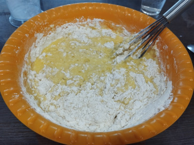 Муку просейте с разрыхлителем и солью и частями добавьте в тесто. Тесто должно получиться однородное, без комочков.