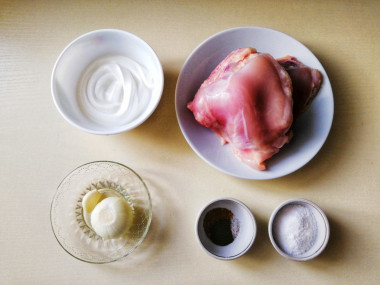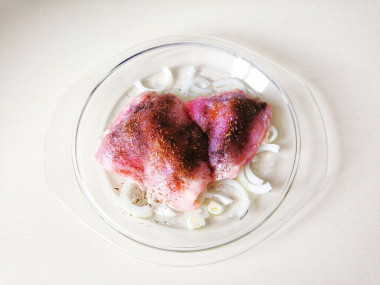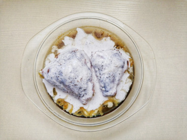 Приготовила на обед курицу в сметане с чесноком в духовке. У меня были для этого два куриных бедра. Кожу с курицы я удалила, срезала пленочки и жирок. Переложила мясо в форму для запекания на подложку из нарезанного полукольцами лука. Посолила, приправила специями, у меня были итальянские травы и черный молотый перец. Специй взяла где-то 0,3 ч. л., мясо оказалось густо посыпанным ими (подумала, что переборщила, но когда попробовала готовую курочку, ощутила потрясающий вкус и аромат!).