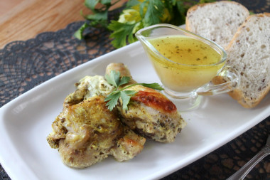 Пока курочка запекалась, приготовила соус. Добавила в сметану немного специй и натертый чеснок (один небольшой зубчик). Сметана у меня была жирная - около 100 г. Влила в ссметану немного воды, чтобы сделать соус более жидким. Полила им мясо и вновь поставила в духовку на 20 минут, фольгой в этот раз не закрывала.