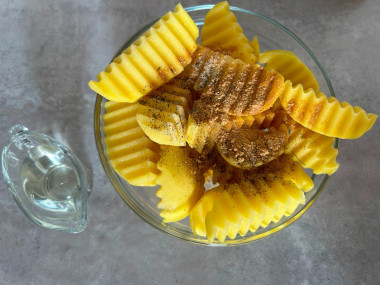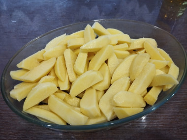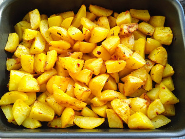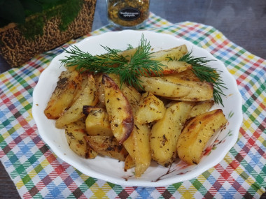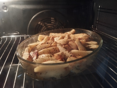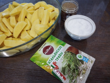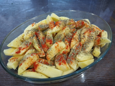 Картофель порезала крупными дольками,выложила в форму для запекания. Добавила соль,специи, перемешала. И отправила в духовой шкаф запекаться при 180° 45 минут.