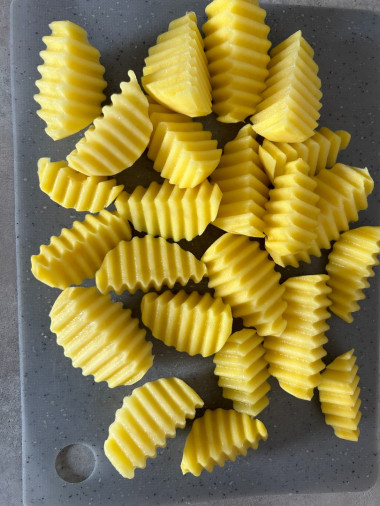 Нарежьте клубни небольшими одинаковыми по размеру дольками.