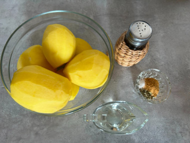 Как запечь картофель дольками в духовке? Возьмите продукты по списку. Выберите 5-6 клубней картофеля среднего размера. Возьмите рафинированное растительное (подсолнечное или оливковое) масло с высокой температурой дымления. Специи выбирайте любые на ваш вкус.