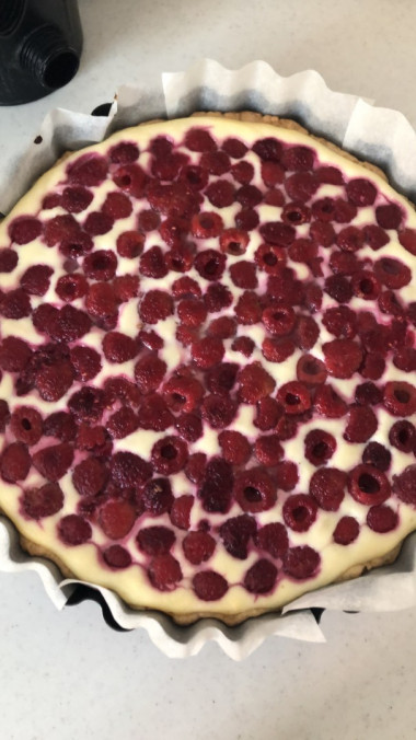 Сверху распределите малину. Верните пирог в духовку еще на 30-35 минут.