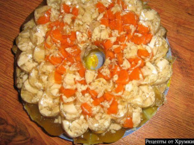 Закрыть кастрюльку крышкой. Варить такое кулинарное чудо 1,5-2,5 часа. После того, как наша кастрюля охладилась нужно вынуть мясо и ножки. Хорошо проваренное мясо легко отделяется от костей, мелко рубится. В горячий бульон необходимо положить предварительно размоченный в холодной воде желатин и нужно размешать его, то есть желатин, до полного желатинного растворения.