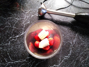 Клубнику помойте и удалите хвостики. Бананы очистите от кожуры и поломайте на кусочки. Подготовленные ягоды клубники и бананы поместите в стационарный блендер. Чем мощнее у вас блендер, тем однороднее и воздушнее будет готовый напиток.