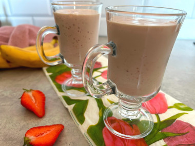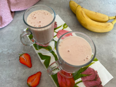 Решила приготовить смузи клубника банан. Готовила из расчета на 2 порции. Взяла 2 банана, клубники у меня было 150 гр., сахар 2 ст. ложки без горки и 350 мл. молока 2,5% жирности. Банан очистила, клубнику помыла и убрала хвостики, все нарезала на средние кусочки, поместила в блендер, добавила сахар и молоко, взбила в течение 1 минуты. Сочетание клубники и банана создает сладкий освежающий и приятный вкус. Такой смузи - это вкусный, полезный и простой в приготовлении напиток, который понравится и взрослым и детям.
