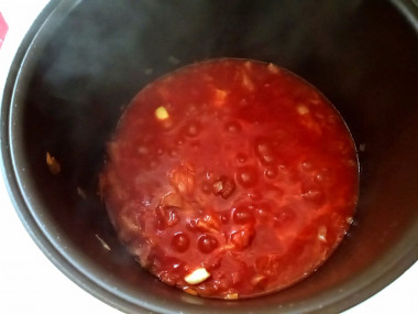 6. Добавляем в чашу мультиварки фасоль и помидоры (помидоры предварительно измельчаем с помощью блендера), а заодно и томатную пасту. Доливаем воду.