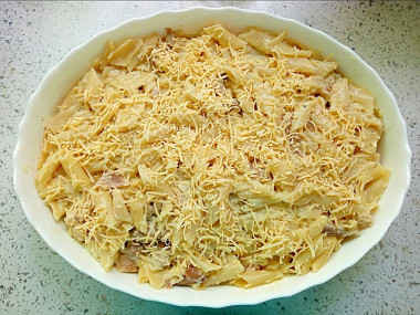 Сыр натрите на мелкой терке. Сыр можно взять любой: твердый, полутвердый, мягкий. Главное, чтобы он был вкусным, без заменителей молочных жиров и хорошо плавился. Немного сыра оставьте для верха.