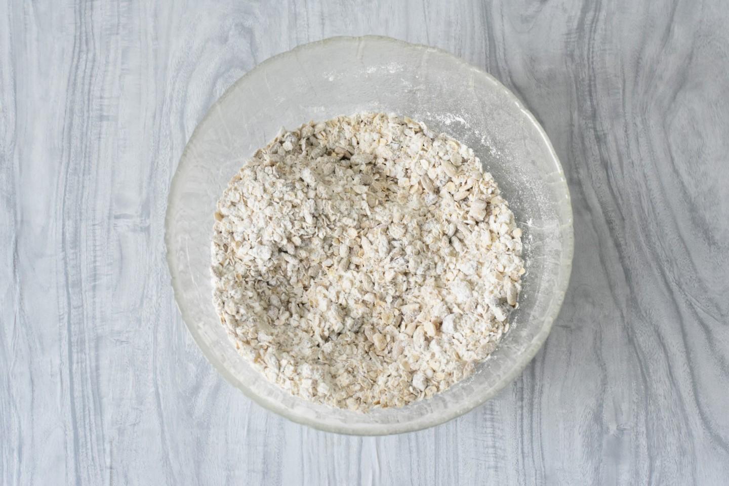 В миске смешайте просеянную муку, овсяные хлопья, семена подсолнечника, грецкие орехи, сахар, соду и соль. Овсяные хлопья бывают разных видов в зависимости от помола. Нам нужны хлопья быстрого приготовления со временем варки 3 минуты. О работе с мукой, и о том, как выбирать овсяные хлопья, читайте в статье под шагами.