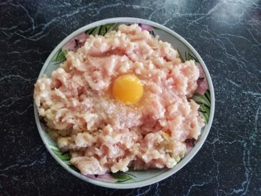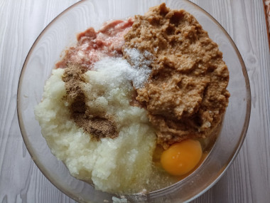 Соедините фарш, хлеб и лук в глубокой миске. Добавьте яйцо и молоко (если замачивали хлеб в воде) и всё тщательно перемешайте, лучше руками.