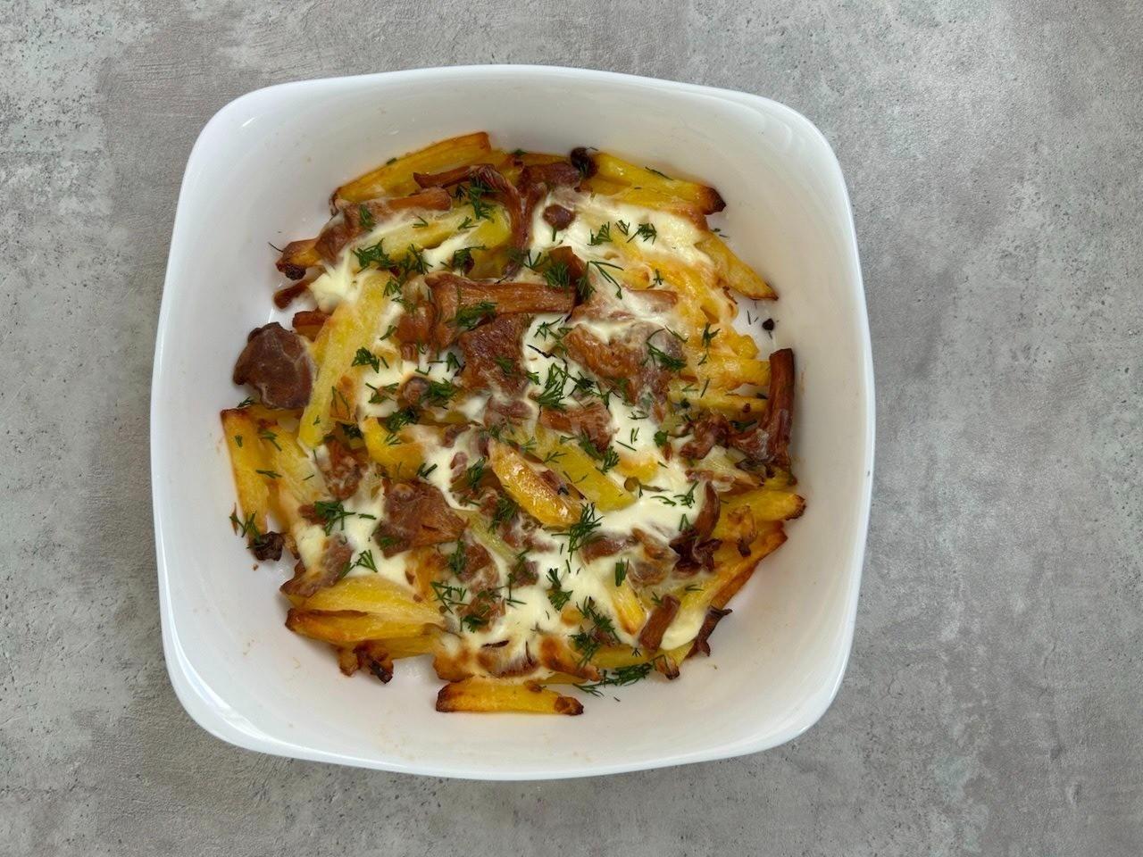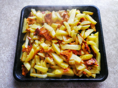 Доводила до готовности картошку с лисичками в духовке на противне. Сметану добавлять не стала.