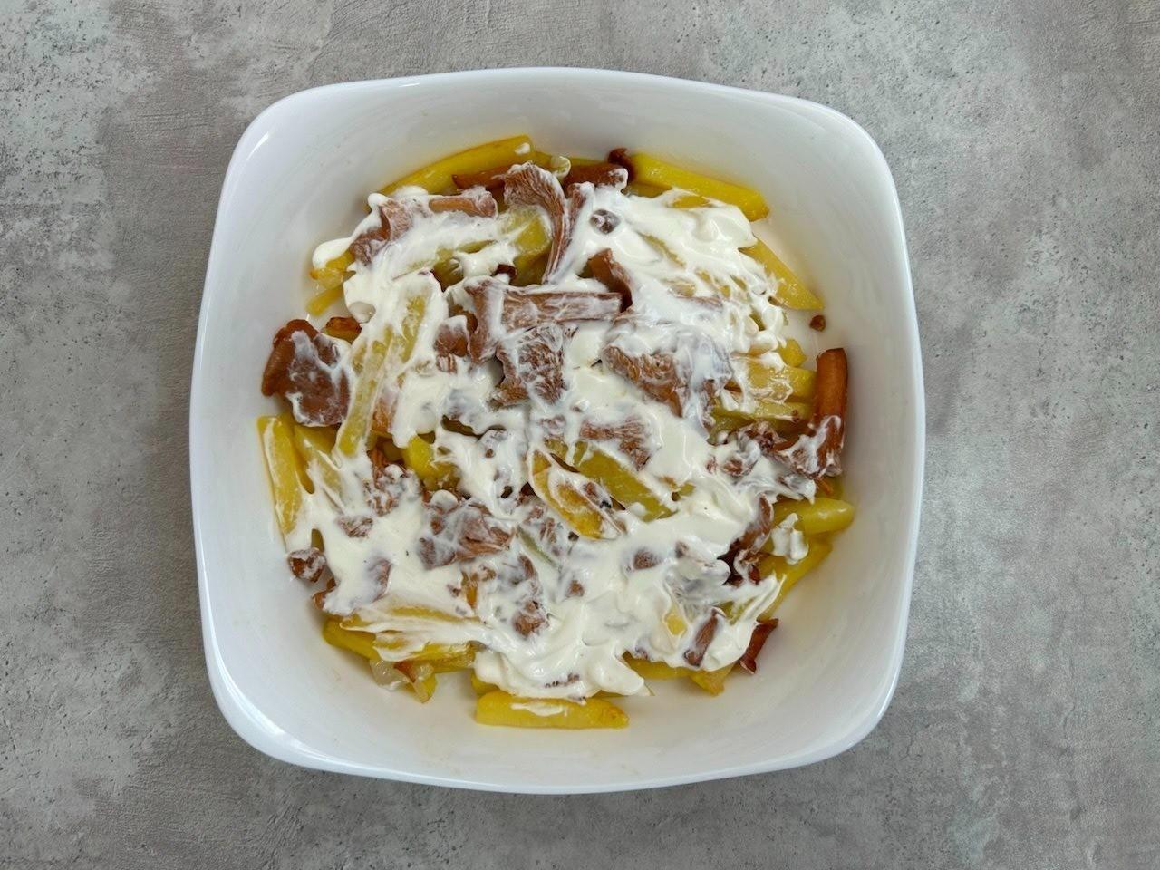 Сверху распределите сметану. Запекайте картофель с лисичками в заранее разогретой до 180 градусов духовке примерно 30 минут под крышкой или накрыв фольгой. Точное время будет зависеть от особенностей работы вашей духовки. Подробнее об этом читайте в конце рецепта.